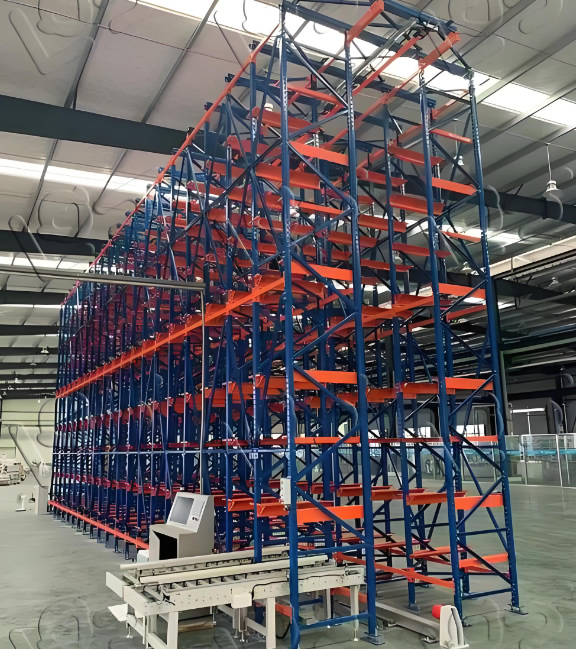 贯通式货架在同样的空间内比通常的托盘货架几乎多一倍的储存能力,因为取消位于各排货架之间的巷道,将货架合并在一起,使同一层、同一列的货物互相贯通。